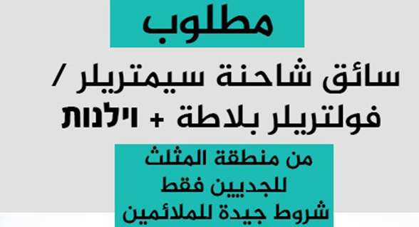 (ممول) مطلوب : سائق شاحنة سيمتريلر | فولتريلر بلاطة + וילנות من منطقة المثلث