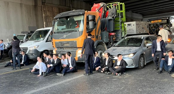 ازدحامات في مدخل ‘جسر الأوتار‘ في القدس بسبب مظاهرة ضد تجنيد الحريديم