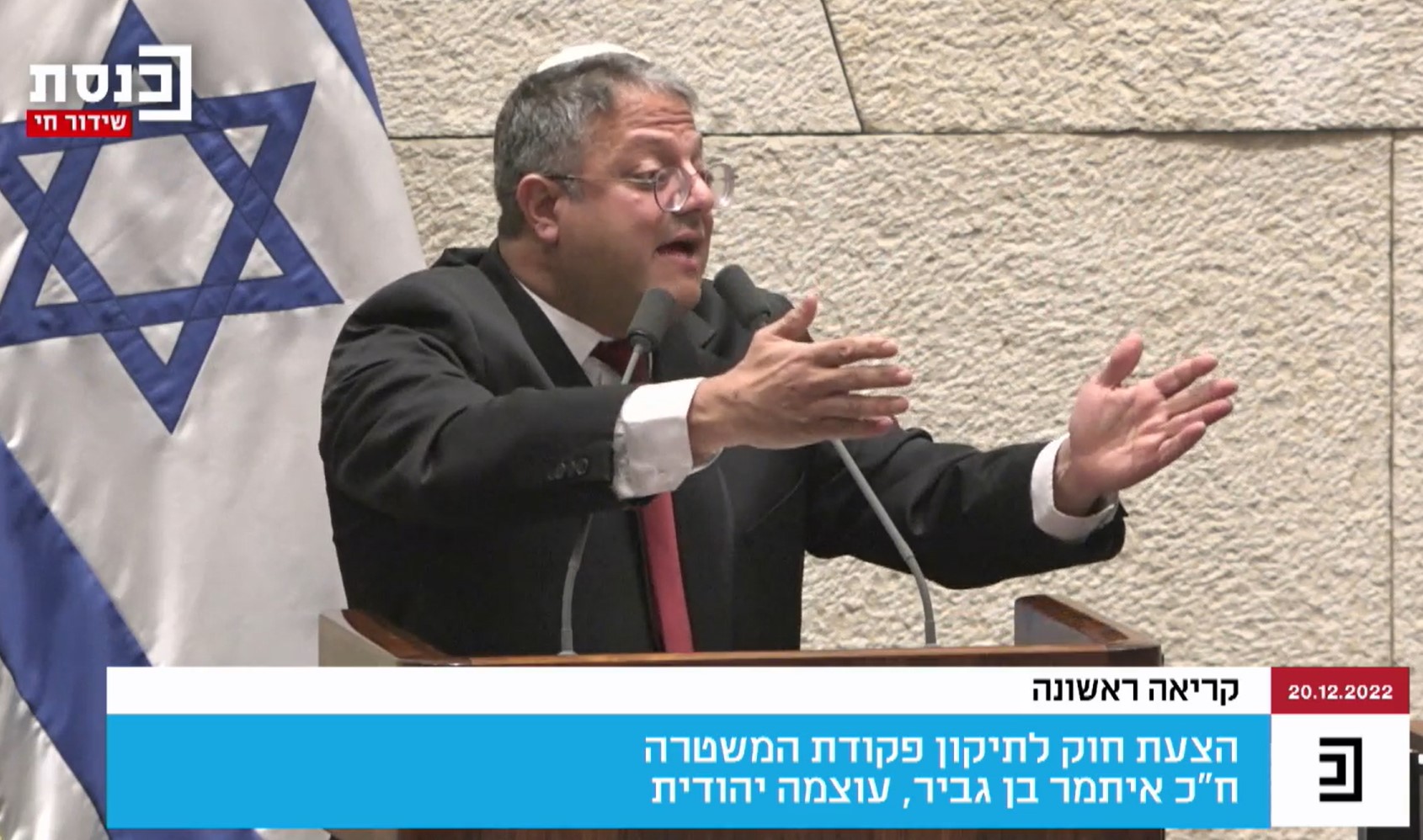 يطرح ، في هذه الاثناء ، في الهيئة العامة للكنيست مشروع " قانون بن غفير " للتصويت عليه بالقراءة الاولى . ويهدف القانون المطروح لنقل الصلاحيات من المفوض