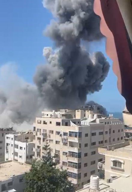 وتصاعدت سحب من الدخان من البرج المكون من 13 طابقا. وقالت مصادر فلسطينية:" كما انذر الجيش الاسرائيلي بقصف برج الكوثر في نفس المنطقة ".
