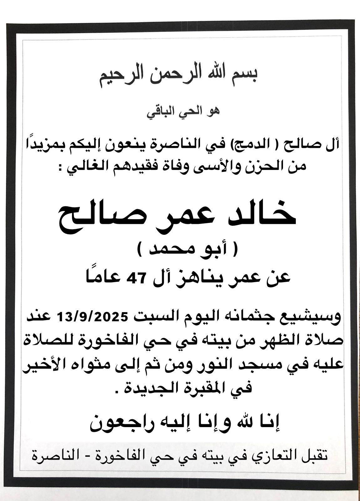 انتقل الى رحمة الله تعالى خالد عمر صالح ( ابو محمد ) عن عمر ناهز الـ 47 عاما . وسيشيع جثمانه الطاهر اليوم السبت عند صلاة الظهر من بيته في حي الفاخورة للصلاة عليه في مسجد النور ومن ثم الى مثواه الاخير في المقبرة الجديدة .