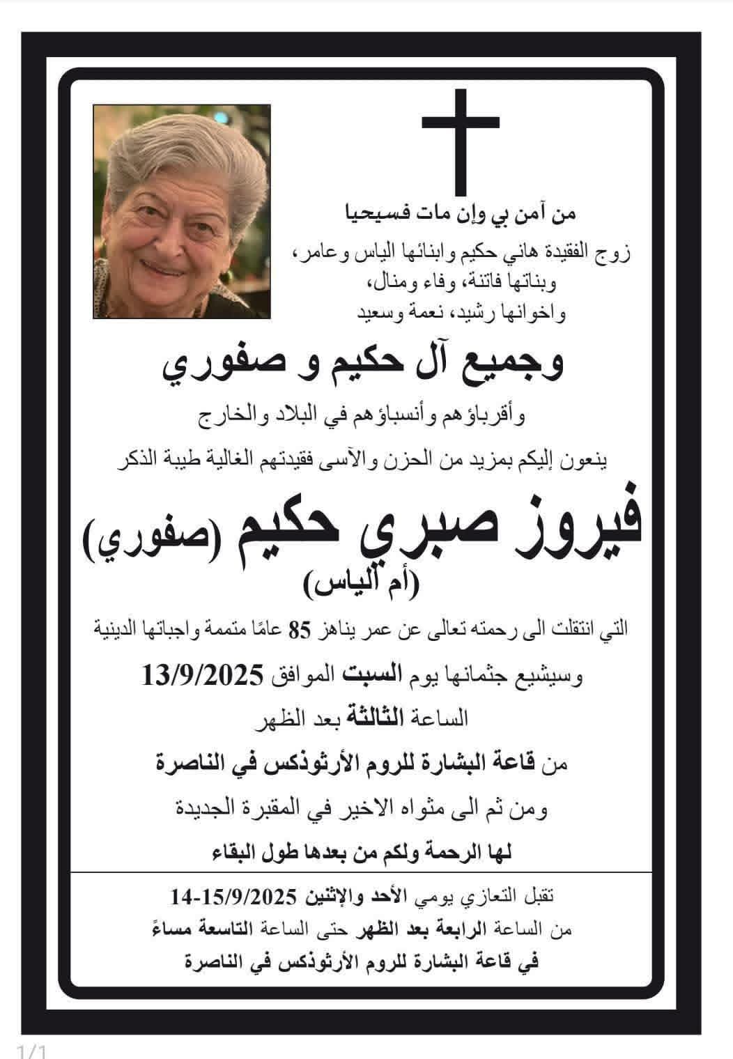 انتقلت الى رحمته تعالى فيروز صبري حكيم ( ام الياس) من الناصرة عن عمر ناهز 85 عاما متممة واجباتها الدينية