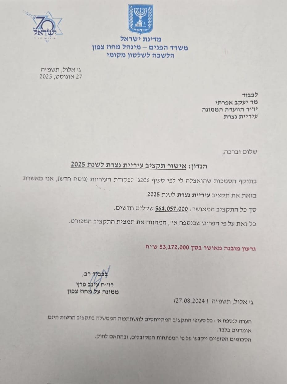 وزارة الداخلية تصادق على ميزانية بلدية الناصرة لعام 2025