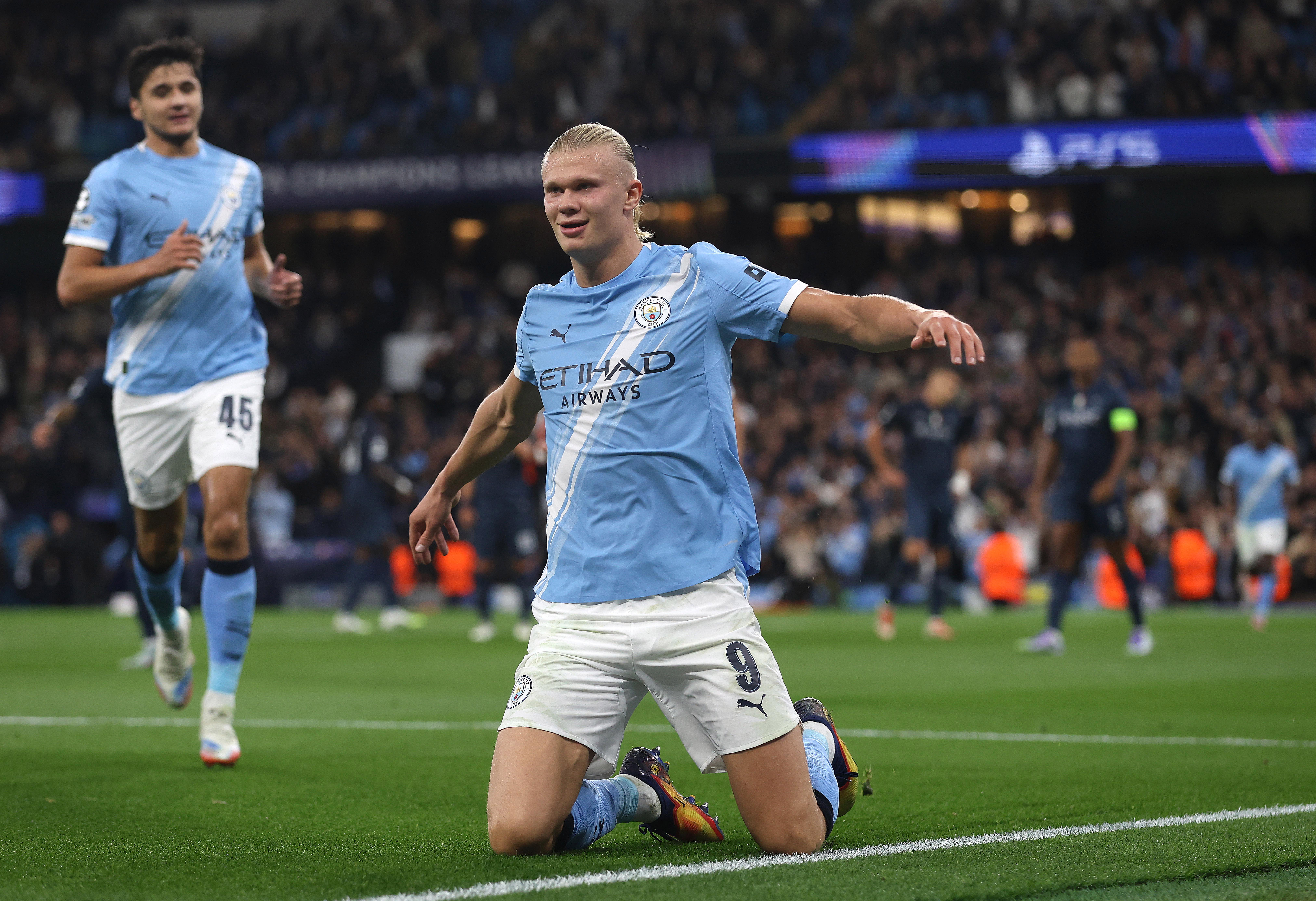 إرلينج هالاند لاعب مانشستر سيتي يحتفل بتسجيله الهدف الأول أمام نابولي في دوري أبطال أوروبا لكرة القدم بمانشستر يوم 18 سبتمبر أيلول 2025 - (Photo by Crystal Pix/MB Media/Getty Images)