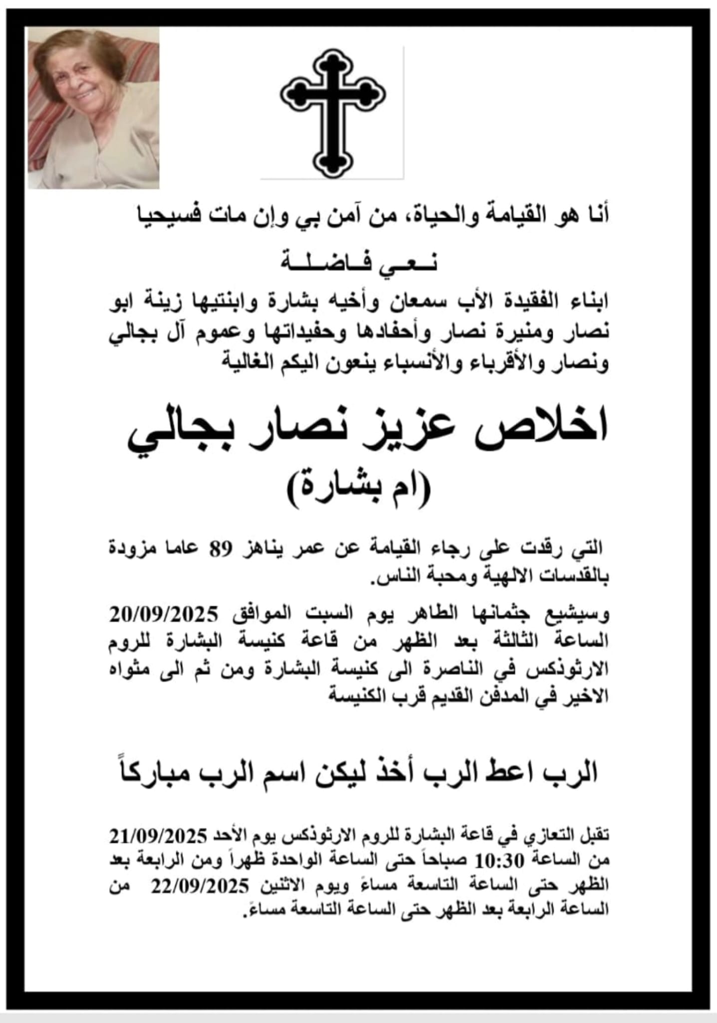 انتقلت الى رجمته تعالى اخلاص عزيز نصار بجالي ( ام بشارة ) من الناصرة عن عمر ناهز الـ 89 عاما .