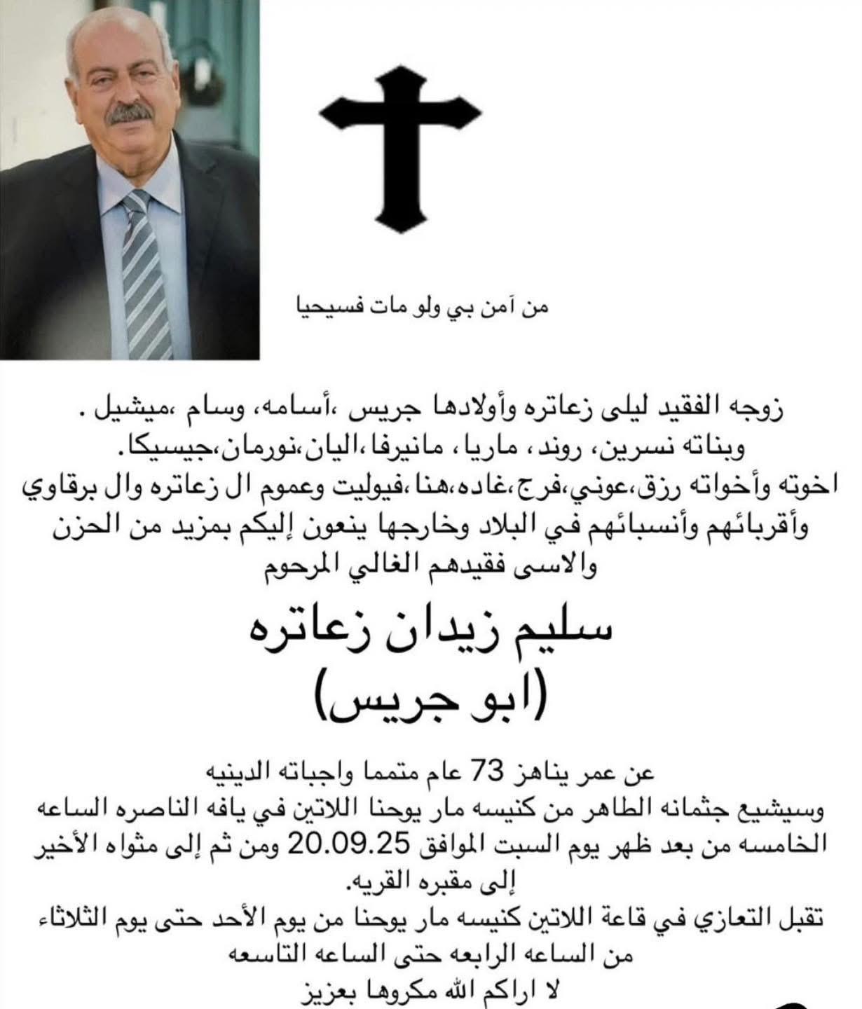 انتقل الى رحمة الله تعالى سليم زيدان زعاترة ( ابو جريس ) عن عمر ناهز 73 عاما . وقد شُيع جثمانه الطاهر من كنيسة مار يوحنا اللاتين في يافة الناصرة .
