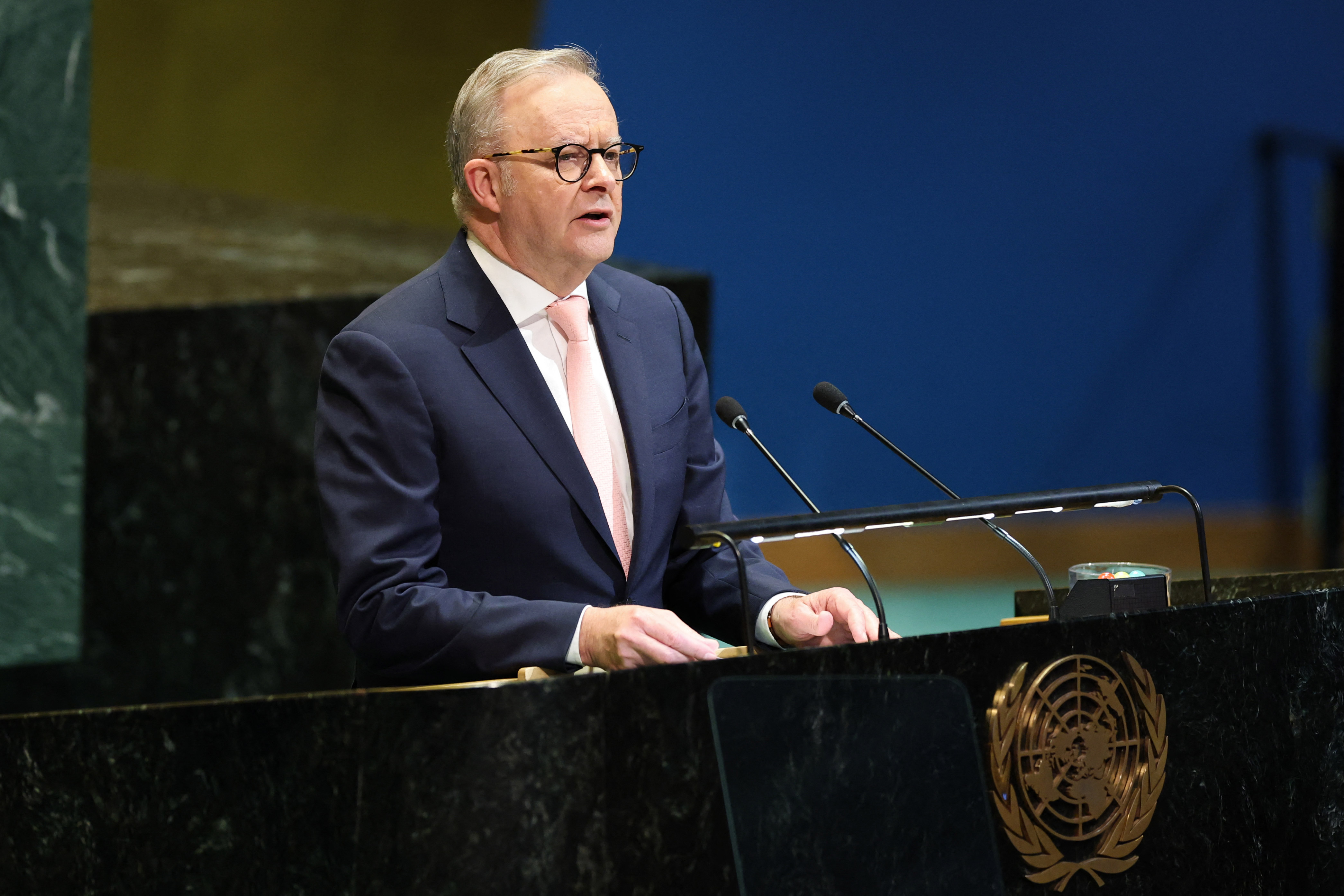 رئيس الوزراء الأسترالي أنتوني ألبانيزي يلقي كلمة خلال قمة في مقر الأمم المتحدة بنيويورك 22 سبتمبر أيلول 2025 - (Photo by ANGELA WEISS/AFP via Getty Images)
