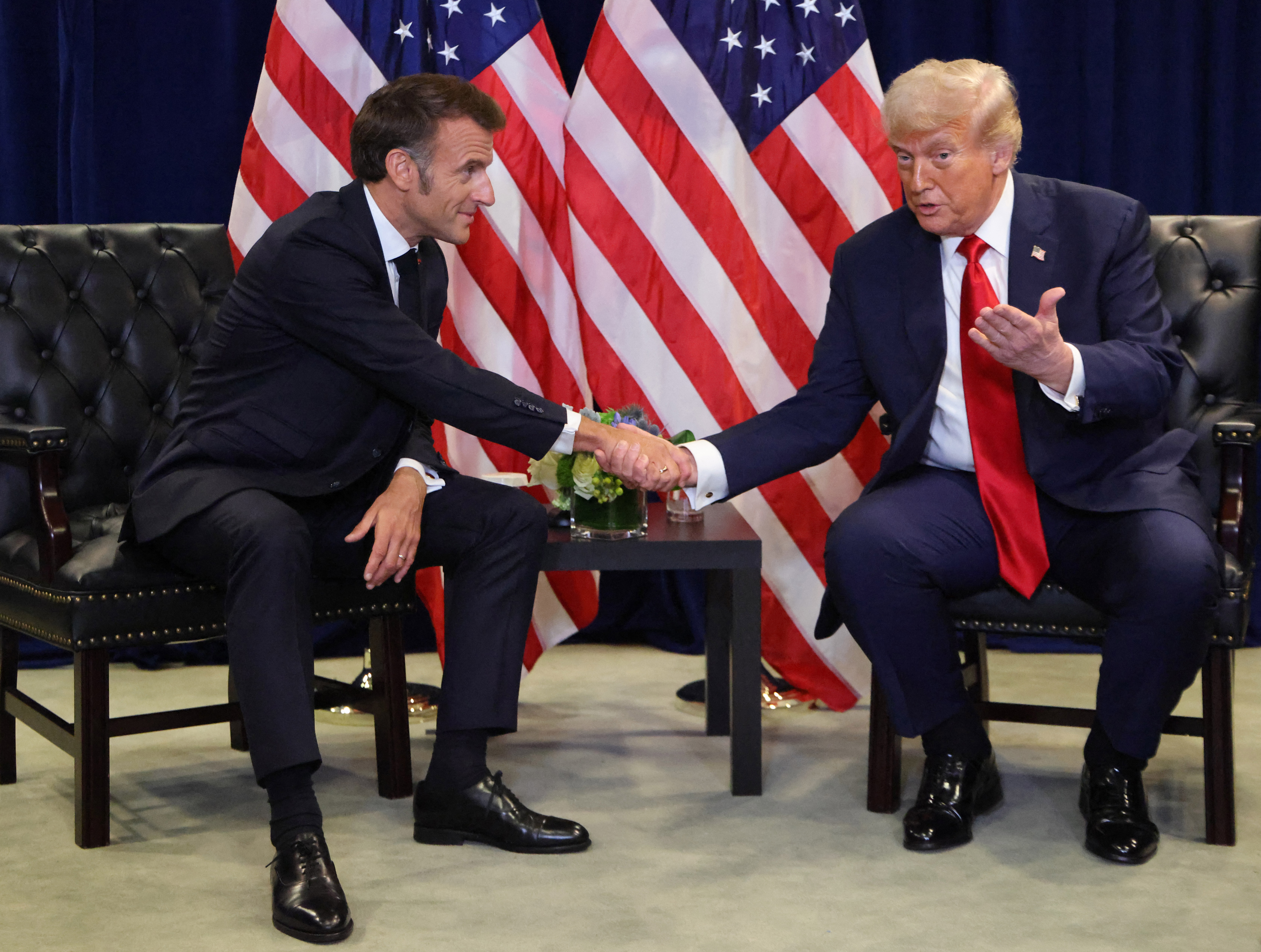 الرئيس الفرنسي إيمانويل ماكرون في لقاء مع نظيره الأمريكي دونالد ترامب على هامش اجتماعات الجمعية العامة للأمم المتحدة في نيويورك يوم الثلاثاء - (Photo by LUDOVIC MARIN/AFP via Getty Images)