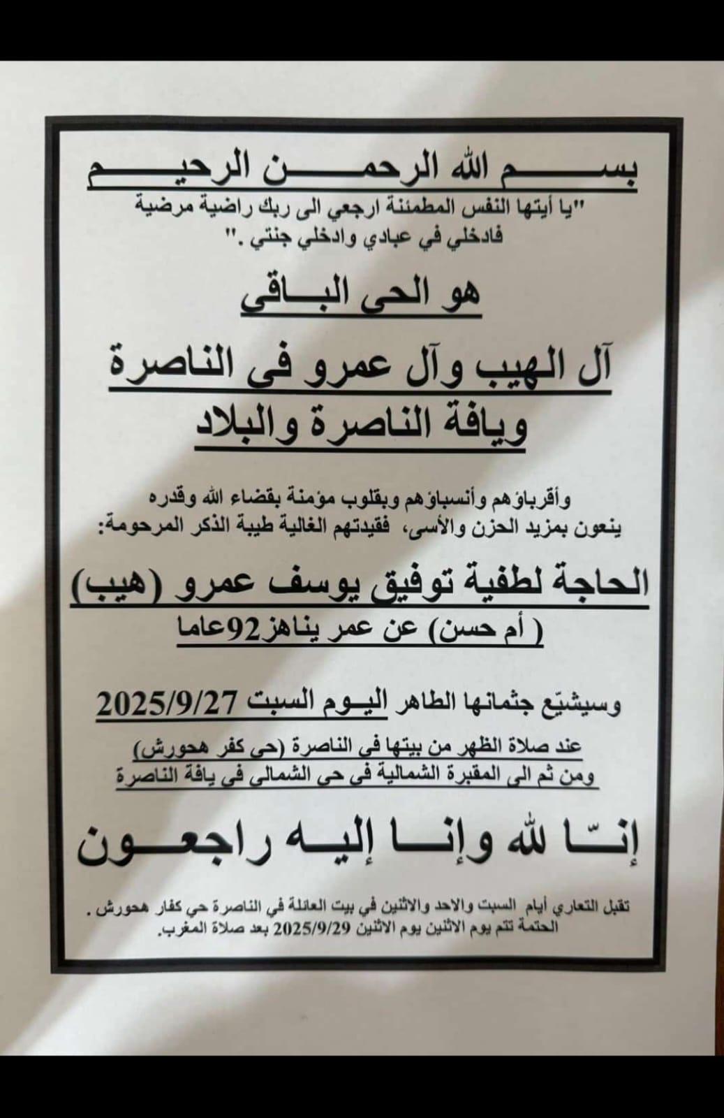 انتقلت الى رحمة الله تعالى، الحاجة لطفية توفيق يوسف عمرو هيب "أم حسن" من الناصرة. تقبل التعازي في بيت العائلة في حي "كفار هحورش" في الناصرة والختمة اليوم بعد صلاة المغرب. انا لله وانا اليه راجعون