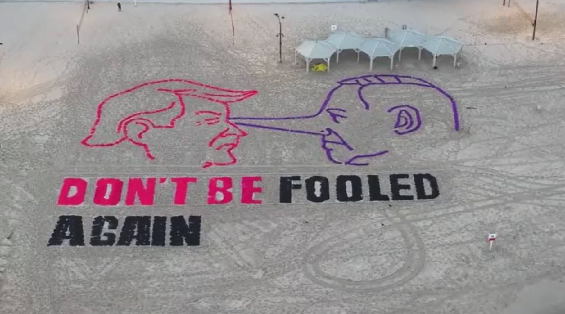 رسالة تعبيرية بالرسم تظهر ترامب ونتنياهو على أحد شواطئ تل أبيب