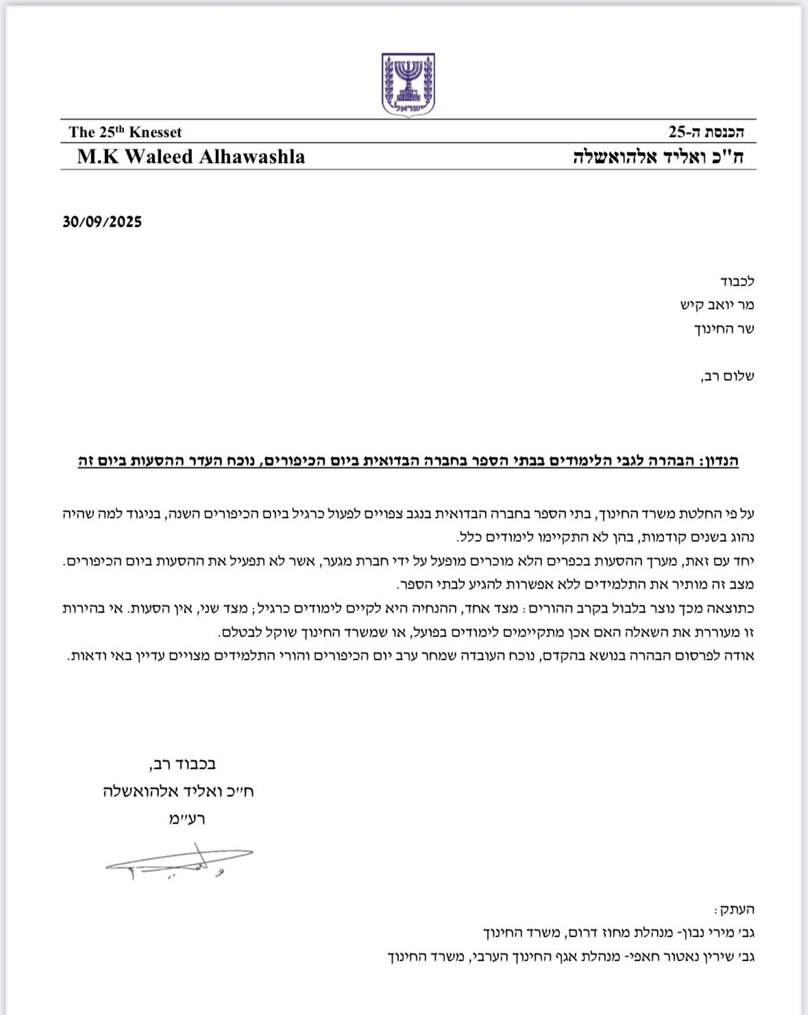 توجّه النائب وليد الهواشلة برسالة عاجلة إلى وزير التربية والتعليم يوآف كيش، طالب فيها "بتوضيح رسمي وعاجل حول قرار الوزارة إبقاء المدارس في المجتمع العربي بالنقب مفتوحة يوم الغفران، بخلاف ما كان معمولًا به في الأعوام السابقة" .