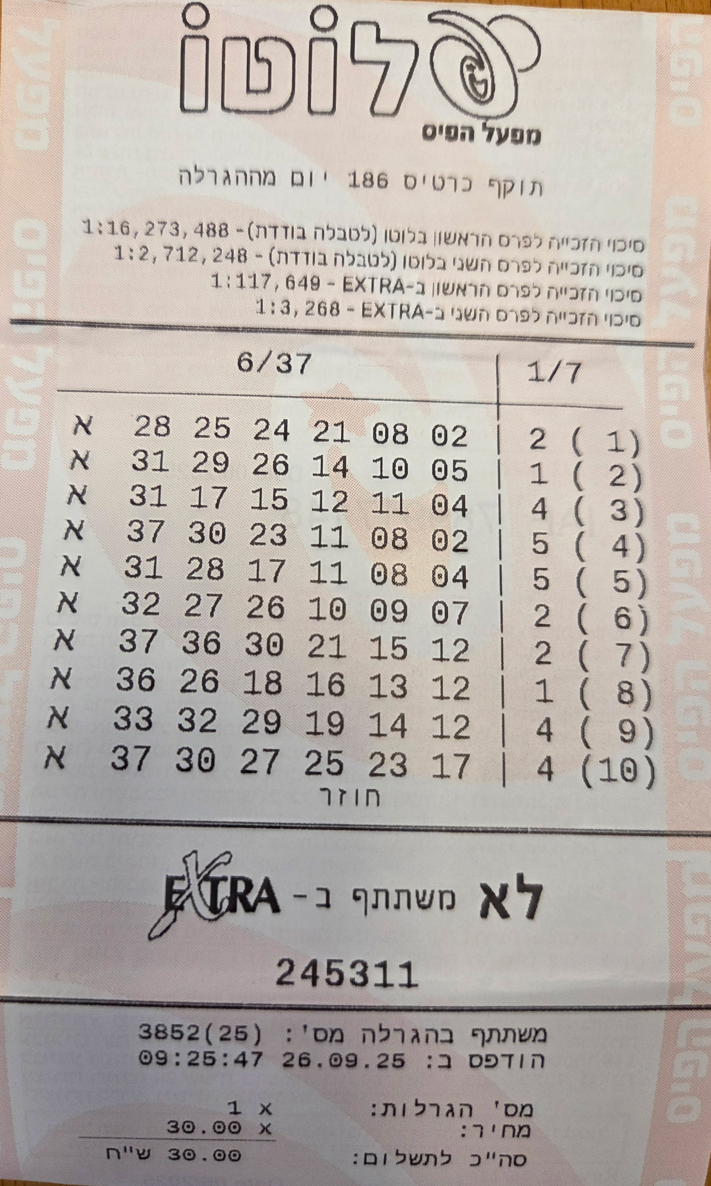 في اليوم التالي للسحب الذي أُجري بتاريخ 27.9.25، والذي تكررت فيه الجائزة الأولى في اللوتو مرتين، بقيمة 8.5 مليون شيكل لكل منهما، وصل الفائزان إلى مقر مفعال هبايس، وهما سيدة ورجل. في الصباح وصلت السيدة،