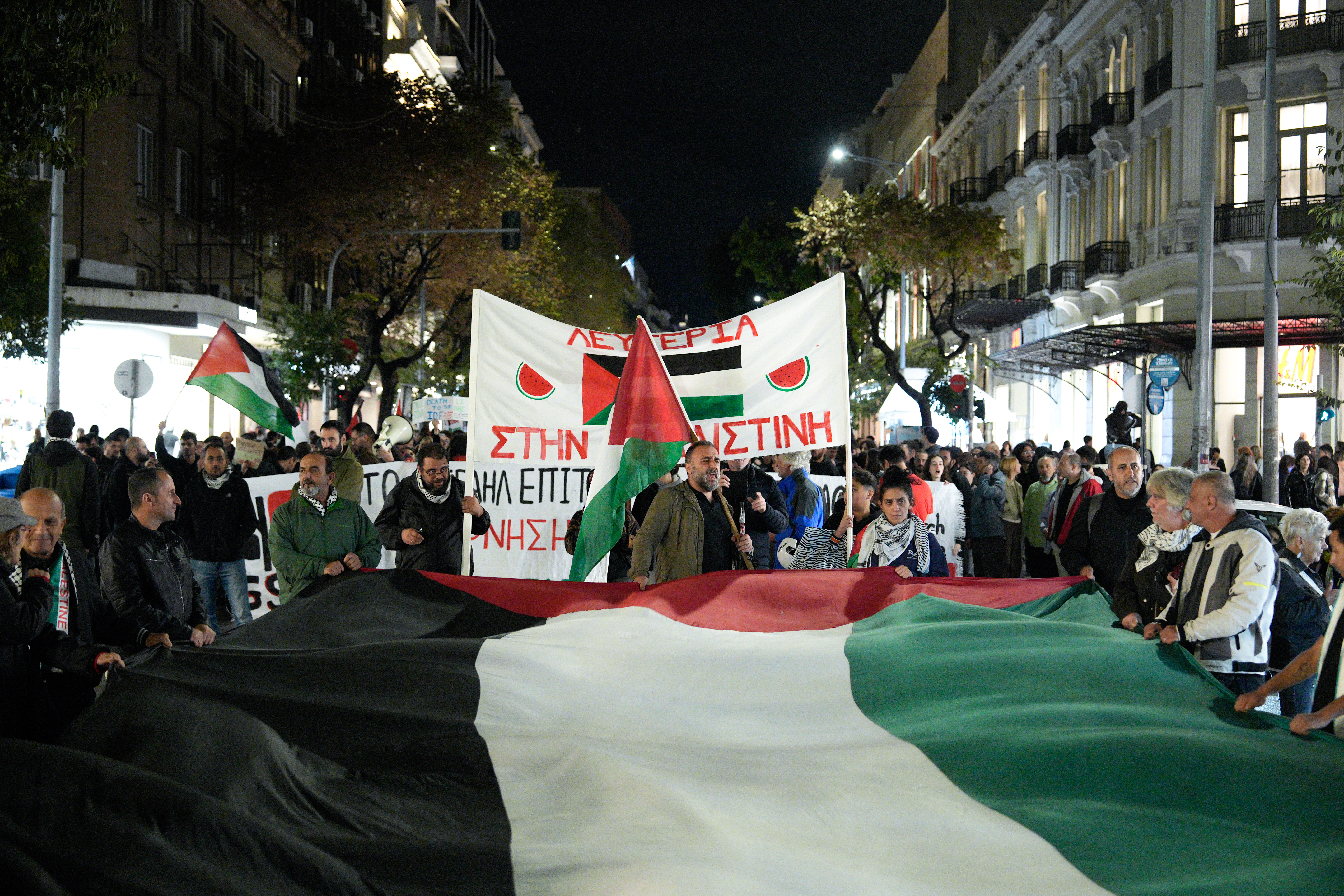 مؤيدون للفلسطينيين يشاركون في احتجاج بمدينة سالونيك اليونانية يوم الخميس لإدانة اعتراض القوات الإسرائيلية لأسطول الصمود العالمي الذي كان متجها إلى غزة حاملا مساعدات إنسانية - . (Photo by Konstantinos Tsakalidis/Anadolu via Getty Images)