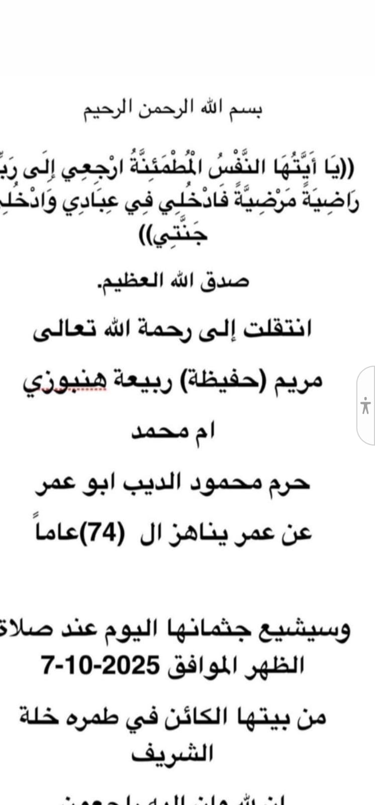 انتقلت الى رحمة الله تعالى مريم ( حفيظة ) ربيعة هنبوزي ( ام محمد ) ، وقد تم تشييع جثمانها الطاهر اليوم عند صلاة الظهر من بيتها الكائن في طمرة خلة الشريف ، الى مثواها الأخير .