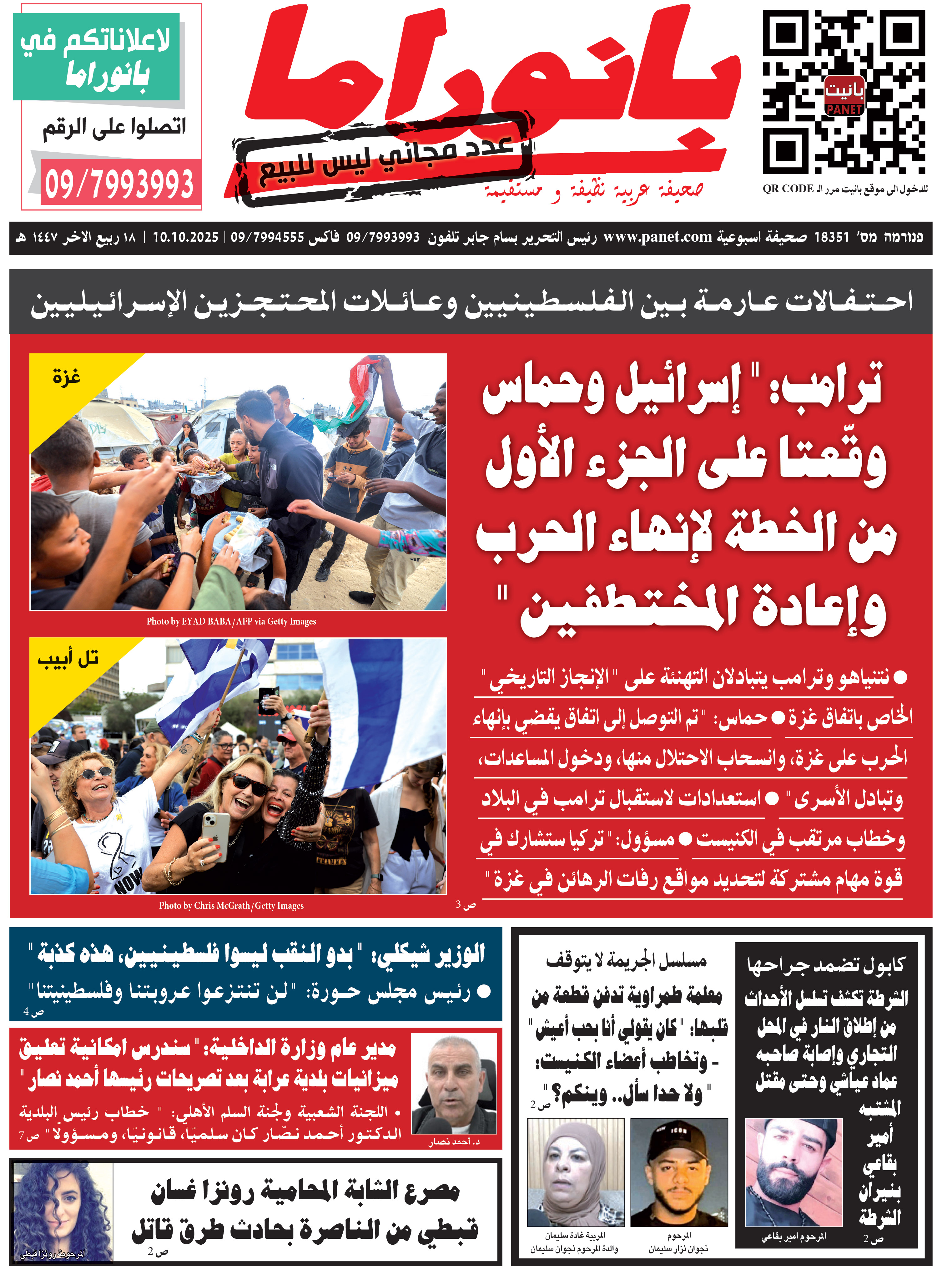 ننشر لزوار موقع بانيت الكرام العدد الجديد من صحيفة بانوراما، اقوى الصحف العربية في البلاد والاكثر شعبية على الاطلاق ، والذي صدر صباح اليوم الجمعة ، الموافق 10.10.2025. تقرأون في هذا العدد من بانوراما مجموعة